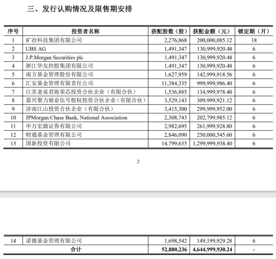值得注意的是,國新投資有限公司獲配1479.96萬股,獲配金額約為13億元;還有,匯安基金獲配了1138.43萬股,獲配金額為10億元左右;還有南方基金、財通基金、諾德基金,也分別獲配162.80萬股、284.61萬股、169.85萬股,獲配金額分別為1.43億元、2.50億元、1.49億元;外資里面,J.P.Morgan兩家合計獲配3.34億元,UBS AG獲配1.31億元。